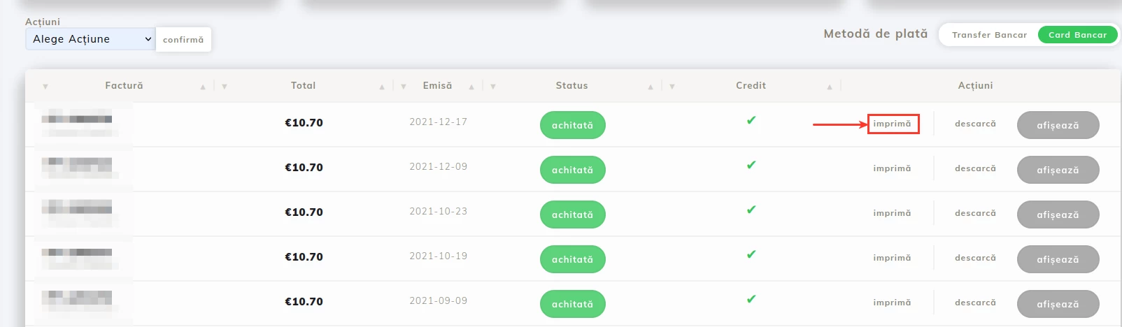 - Фактурата ще бъде видима само в RON от версията hostico.ro (разширението hostico.com не показва фактури в леи);